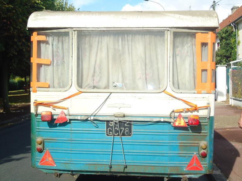 La caravane est sortie de son abri, je peux la voir de derrière. Par sécurité, nous avons scotché les baies pour ne pas risquer de perdre des pièces.
