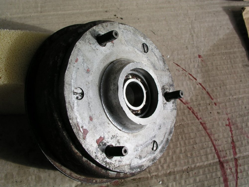 C'est seulement en remontant les moyeux et les tambours que je me suis rendu compte que d'un coté cela boitait un peu et que, du coup les têtes de goujons de roues touchaient le mécanisme de freinage (came) à chaque rotation, le roulement intérieur avait battu dans son logement.